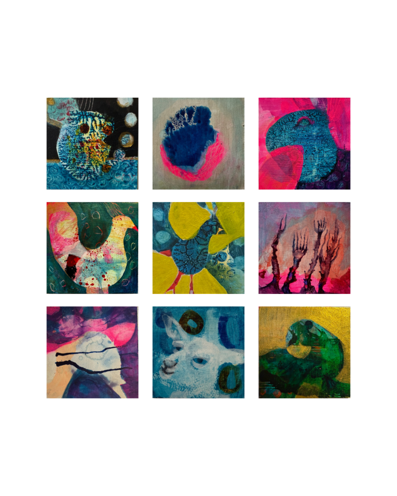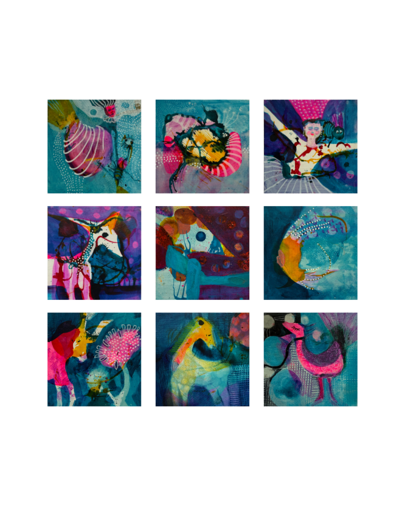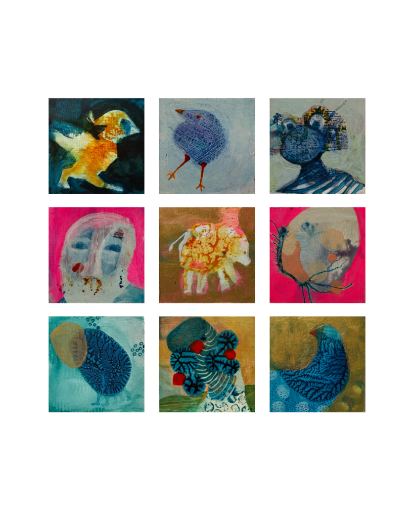 Ähnlich wie bei meinen größeren Arbeiten entwickeln sie die Minis in aufeinanderfolgenden Arbeitsschritten. Immer wieder setze ich neu an und entscheide intuitiv, was bleibt und trägt.